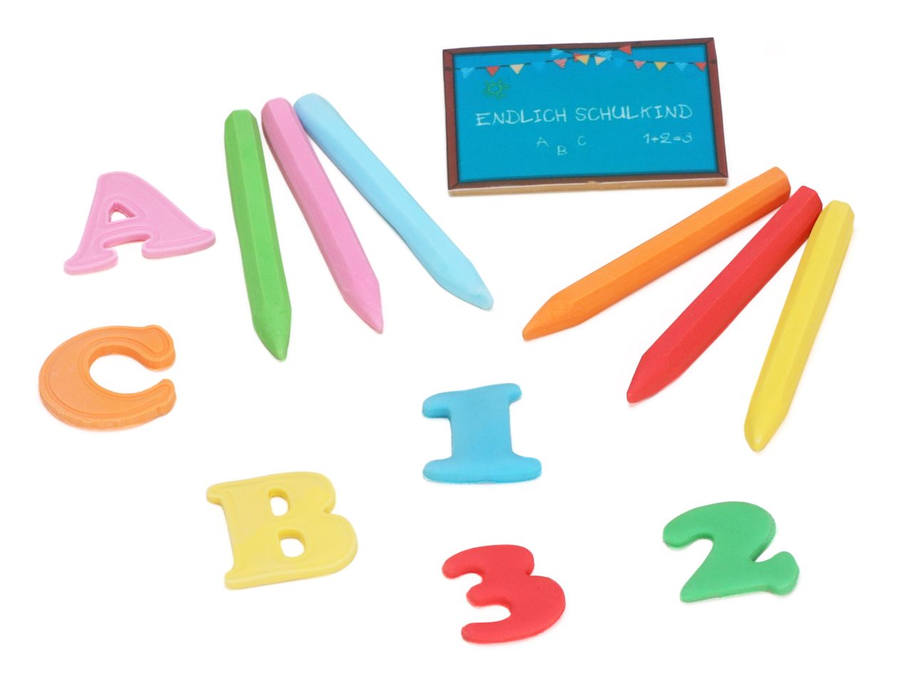 In Handarbeit hergestellte Zuckerdekore für Einschulungstorten. Die ideale Deko für Torten, Kuchen, Cupcakes uvm. Sie erhalten 3 Buchstaben, 3 Zahlen, 4 Buntstifte und eine Schultafel