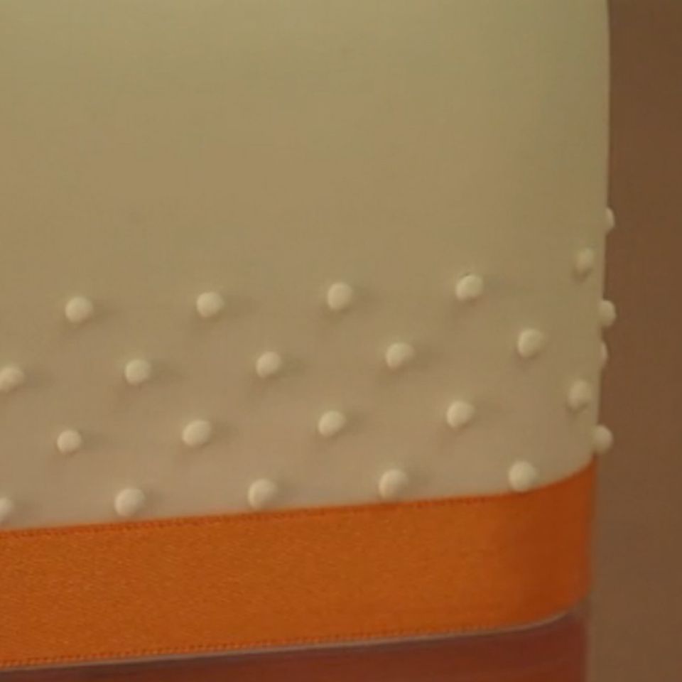 Um einen Rand um die gesamte Torte zu machen, das Eindrücken des Werkzeugs mehrmals wiederholen. Dabei immer die erste Reihe des Werkzeugs in die letzten ausgedrückten Punkte auf der Torte setzen. Auf diese Weise bleibt der Abstand zwischen allen Punkten gleich.