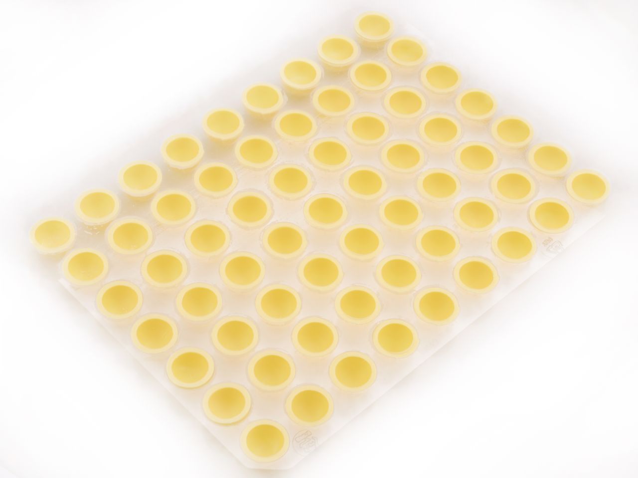 Sie erhalten 10 Folien mit je 63 Schalen in weißer Schokolade.